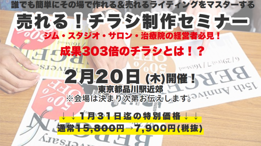 2020.2.20(木)12:00~17:00品川近郊にて 『売れる!チラシ制作セミナー』を開催いたします。 さぁ治療院を立ち上げた! まずは知ってもらわなくちゃ!! そう思ったとき、一番に考えるのはチラシ制作だと思います。 チラシなんて作ったことないし・・・ デザインなんてわからない・・・ まして […]